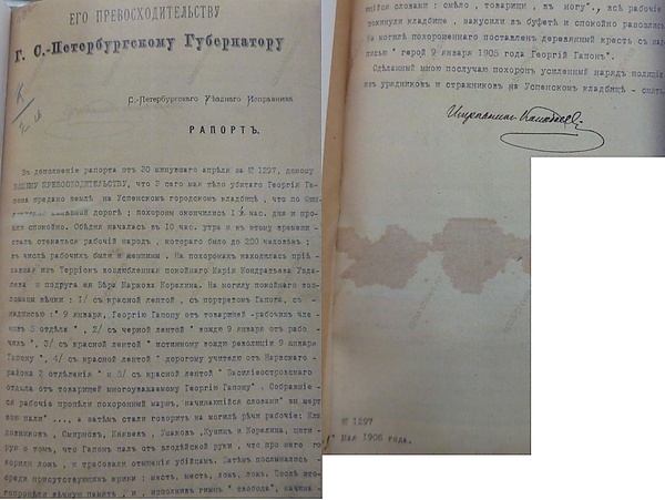Посетителей было более пяти тысяч, причем из них около 100 человек были из партии революционеров, которые после церковного богослужения на могиле бывшего священника Георгия Гапона служили панихиду, по окончании каковой один из ораторов взойдя на могилу Гапона произнес: «Товарищи, соединитесь» и хотел начать произносить речь по адресу относящуюся к покойному Гапону, но последний мной был предупрежден, чтобы речей никто не произносил. После чего все гапоновцы пропели «вечную память» и отправились посетить могилы «борцов за свободу», погребенных и убитых 9 января 1905 г. и после этого тихим образом все разошлись.