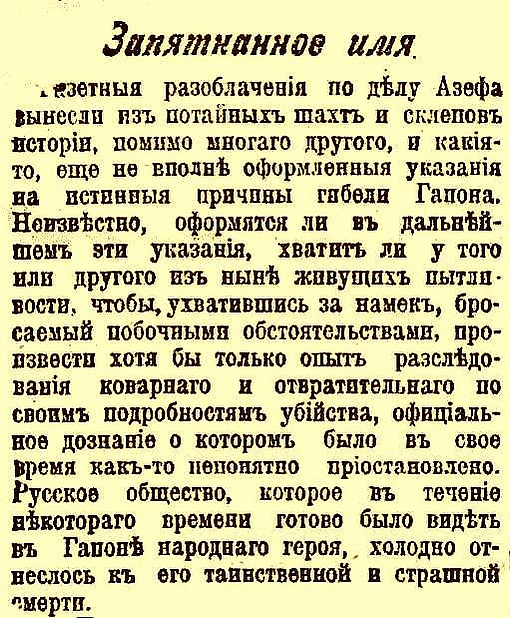 Разоблачение Азефа привлекло внимание общественности к делу Гапона. Журналисты выражали надежду, что это событие поможет раскрыть истинные причины убийства Гапона. Философ и публицист А. С. Изгоев полагал, что разоблачение Азефа — это факт, который должен дать толчок пересмотру дела Гапона[71]. Историк событий 9 января 1905 года Любовь Гуревич писала: «Газетные разоблачения по делу Азефа вынесли из потайных шахт и склепов истории, помимо многого другого, и какие-то, ещё не вполне оформленные указания на истинные причины гибели Гапона. Неизвестно, оформятся ли в дальнейшем эти указания, хватит ли у того или другого из ныне живущих пытливости, чтобы, ухватившись за намёк, бросаемый побочными обстоятельствами, произвести хотя бы только опыт расследования коварного и отвратительного по своим подробностям убийства, официальное дознание о котором было в своё время как-то непонятно приостановлено»[72]. В печати стали появляться новые факты и разоблачения.