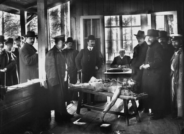 После осмотра места преступления тело убитого было вынуто из петли и перенесено на первый этаж для вскрытия. Вскрытие производили профессор Д. П. Косоротов и доктор А. И. Мищенко. На вскрытии присутствовали следователь по особо важным делам Н. В. Зайцев, прокурор С. Н. Трегубов, исправник Санкт-Петербургского уезда В. И. Колобнев, присяжный поверенный С. П. Марголин, представители рабочих организаций и печати. По словам профессора Косоротова, тело удивительно хорошо сохранилось, несмотря на то, что провисело на даче более месяца[39]. Вскрытие подтвердило, что смерть наступила от удушения, но осталось неясным, был ли покойный удавлен или повешен. В пользу удавления говорило то, что покойный находился в полусидячем положении, а повесить человека в таком положении невозможно; следовательно, он был подвешен на крюк уже в бессознательном состоянии. В пользу повешения говорило то, что у покойного были переломаны шейные хрящи, а на ногах сохранились следы от ударов; было высказано предположение, что покойного били по ногам, чтобы он не смог подняться. Вскрытие также подтвердило, что убийство сопровождалось продолжительной борьбой. Волосы на голове покойного слиплись и местами прилипли к черепу, как бывает после усилий, вызывающих обильное выделение пота[39]. Покойный имел атлетическое телосложение и развитую мускулатуру.