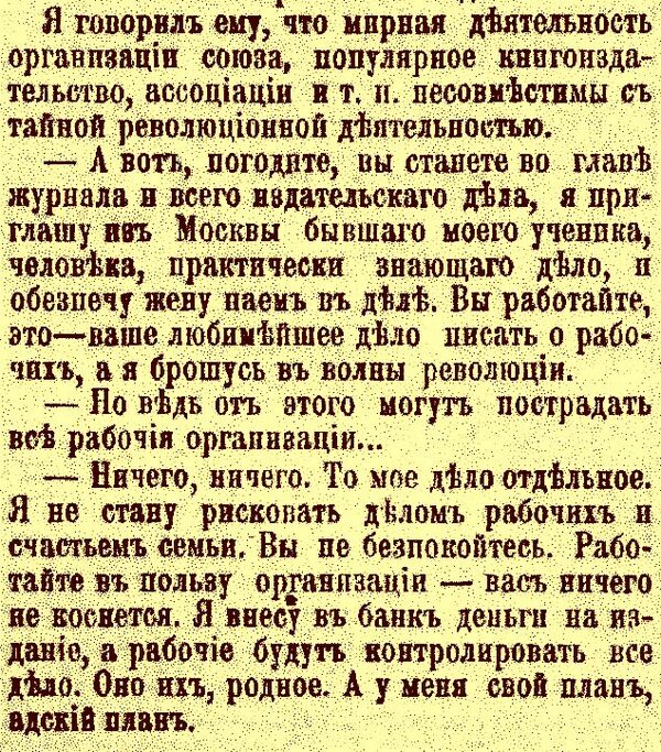 «Гапона затравили. Распространяли о нём пасквили и клевету. — Я покажу, что из себя представляю, — не раз говорил Гапон. — Они ещё узнают, что я не грязная личность. И как был честным человеком, честным и останусь. — Слушая эти речи, мы не знали, что он затевает: писать в газету или прибегнуть к террору. Случайно я узнал, что он решил избрать второй путь. Однажды ко мне пришёл мой приятель, рабочий Андрих, Владимир Антонович, и сказал, что Гапон зовёт его в боевую группу, которую начал составлять, задумав убить Рачковского, Витте и др. — Ничего из этого не выйдет. Террор вызовет ответный террор, — сказал я. Андрих послушался меня и не вошёл в боевую группу. Гапон о своем намерении рассказал Рутенбергу, этот последний Азефу, а от Азефа узнал и Рачковский»[89].