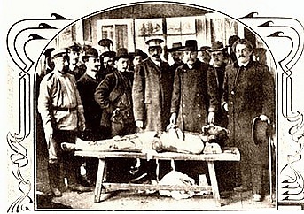 «Самое убийство, по определению врачей-экспертов, произведено было с выдающейся жестокостью, доходящей до цинизма. Смерть была медленная и, вероятно, крайне мучительная. Если Гапон не чувствовал страдания от удушения, то лишь потому, что он был ранее оглушён ударом по голове. На трупе обнаружены следы жестокой борьбы. Убийство, по мнению врачей, произошло на месте, т. е. в верхнем этаже дачи в Озерках; убийцы проявили чисто профессиональное зверство, — они пили и ели до убийства, быть может и после него. Вся обстановка указывает скорей на наёмных убийц, чем на людей, руководившихся идеей революционной казни»[44].