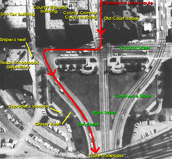 Двигаясь по Мэйн-стрит, кортеж въехал в район Далласа под названием Дили Плаза (Dealey Plaza) и повернул направо, на Хьюстон-стрит. В этот момент Нелли Конналли повернулась к Джону Кеннеди и сказала: «Мистер президент, согласитесь, что Даллас вас любит», на что Кеннеди ответил: «Разумеется»[16][17]. На Хьюстон-стрит агент Хилл вернулся на подножку машины охраны. На следующем перекрёстке лимузин свернул налево, на Элм-стрит. После того, как лимузин проехал мимо расположенного на углу Хьюстон-стрит и Элм-стрит школьного книгохранилища, ровно в 12:30[18] раздались выстрелы. Большинство свидетелей утверждает, что слышали три выстрела[19][20], хотя отдельные свидетели говорили о двух или четырёх, или, возможно, даже пяти или шести выстрелах[20]. Первая пуля, по официальной версии, попала Джону Кеннеди в спину, прошла насквозь и вышла через шею, также ранив в спину, правое запястье и левое бедро сидевшего впереди него Джона Конналли[21]. В то же время, давая показания комиссии Уоррена, Конналли говорил, что был уверен, что он был ранен вторым выстрелом, которого не слышал[22]. Через пять секунд был сделан второй выстрел[23][24]. Пуля попала Кеннеди в голову, проделав в правой части его головы выходное отверстие размером с кулак, так что часть салона была забрызгана фрагментами мозга. Сразу после первого выстрела агенты Джон Риди и Пол Лэндис (они стояли на правой подножке машины сопровождения президента) начали тревожно оглядываться по сторонам[25]. Агент Хилл спрыгнул с левой подножки, догнал президентский лимузин и попытался забраться в машину; ему удалось это сделать только со второй попытки, уже после второго выстрела[24]. Увидев простреленную голову президента, он обернулся к коллегам и показал большой палец, обращённый вниз. Хилл утверждает, что не слышал второго выстрела, зато слышал и «чувствовал» третий, и прикрывал чету Кеннеди в ожидании четвёртого[26].