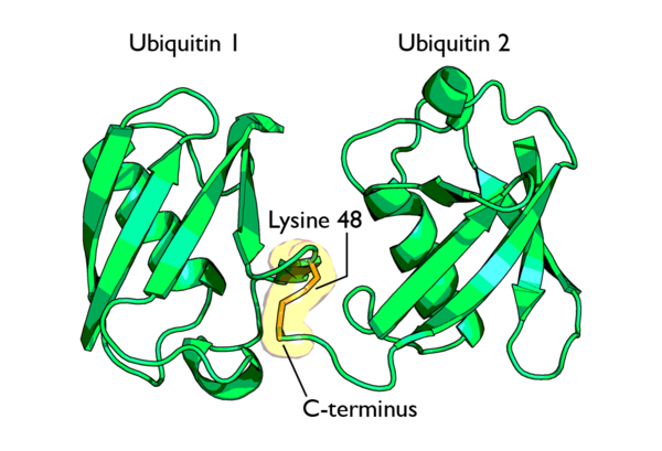 При помощи полиубиквитиновых цепочек, образованных связью через остаток лизина-48, помечаются белки-мишени, подлежащие протеолитическому распаду.