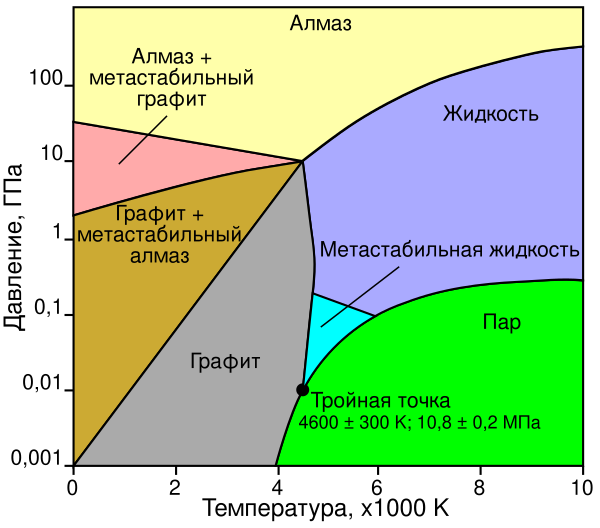 Жидкий углерод существует только при определённом внешнем давлении. Тройные точки: графит — жидкость — пар Т = 4130 K, р = 10,7 МПа и графит — алмаз — жидкость Т ≈ 4000 K, р ≈ 11 ГПа. Линия равновесия графит — жидкость на фазовой р, Т-диаграмме обладает положительным наклоном, переходящим по мере приближения к тройной точке графит — алмаз — жидкость в отрицательный, что связано с уникальными свойствами атомов углерода создавать углеродные молекулы, состоящие из различного количества атомов (от двух до семи). Наклон линии равновесия алмаз — жидкость, в отсутствие прямых экспериментов в области очень высоких температур (более 4000—5000 K) и давлений (более 10—20 ГПа), долгие годы считался отрицательным. Проведённые японскими исследователями прямые эксперименты[16] и обработка полученных экспериментальных данных с учётом аномальности высокотемпературной теплоёмкости алмаза[17][18] показали, что наклон линии равновесия алмаз — жидкость положителен, то есть алмаз плотнее жидкого углерода (в расплаве он будет тонуть, а не всплывать как лёд в воде).