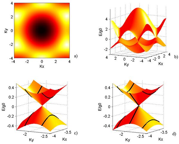 Если энергия электронов мало отличается от энергии Ферми, то можно заменить истинный спектр электронов вблизи дираковской точки на простой конический, такой же как спектр безмассовой частицы, подчиняющейся уравнению Дирака в 2+1 измерениях.