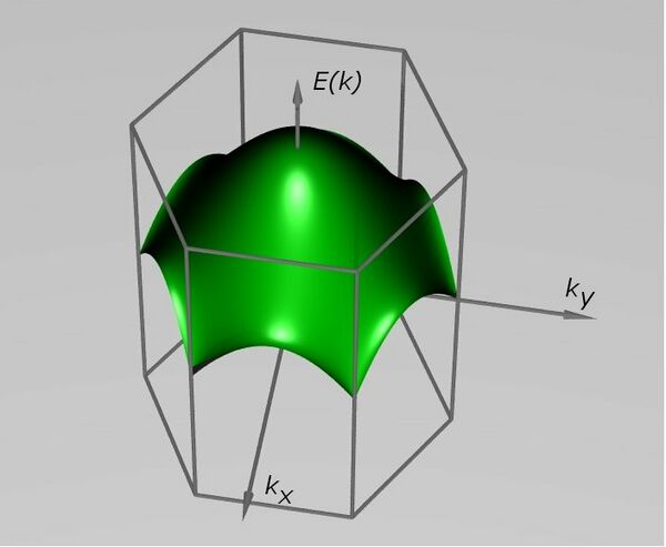 Графит — полуметалл, что видно невооружённым глазом по характеру отражения света. Можно убедиться, что электроны p-орбиталей полностью заполняют первую зону Бриллюэна. Таким образом, оказывается, что уровень Ферми графитовой плоскости проходит точно по дираковским точкам, т. о. вся поверхность Ферми (точнее, линия в двумерном случае) вырождается в две неэквивалентные точки.