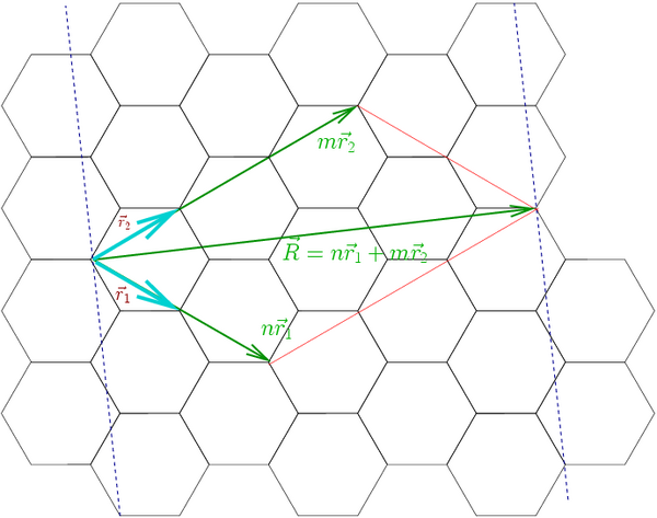 Диаметр нанотрубки рассчитывается по диаметру цилиндра, длина окружности которого равна длине вектора R и выражается через индексы хиральности (n, m) как: