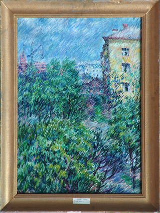 На картине представлен пейзаж с высоким горизонтом, выполненный в солнечный день. Нижнюю часть занимает густая зелёная листва деревьев, сквозь которую справа виден серо-фиолетовый тротуар. Справа изображён фасад жёлтой пятиэтажки, а слева за кронами деревьев фрагментарно открывается панорама города с элементами стройки, а также старыми и новыми домами, что придаёт работе черты городского пейзажа. Облачное небо занимает около трети композиции. В живописной манере заметен длинный продольный мазок, подчёркивающий особенности техники автора.