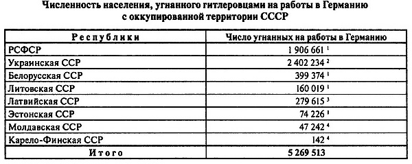 Немцы называли их «остарбайтерами» (восточными рабочими). В соответствии с государственными инструкциями немецких властей предусматривалось, что «все рабочие должны получать такую пищу и такое жильё и подвергаться такому обращению, которые бы давали возможность эксплуатировать их в самой большой степени при самых минимальных затратах». Уровень смертности среди угнанных в Германию советских людей был очень высок.