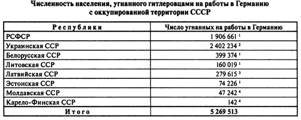 По данным советских республик и Управления уполномоченного СНК СССР по делам репатриации, гитлеровцы депортировали в Германию на принудительную работы с оккупированных территорий СССР 4 794 087 советских граждан. В западные районы СССР нацисты перегнали 1 153 475 советских граждан. Большинство из них были репатриированы на родину (более 3,2 млн человек)[31].