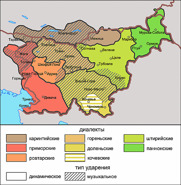 В литературном словенском различаются три интонации: краткая нисходящая (в транскрипции ȁ или à), долгая нисходящая (ȃ) и долгая восходящая (á). Противопоставление кратких и долгих ударных гласных по ударением возможно только в конечном слоге. Старое нисходящее ударение сдвинулось на один слог ближе к концу слова: *ȍbvolkъ > oblȃk «облако» (шток. ȍblāk), *zȏlto > zlatọ̑ «золото» (шток. zlȃto). Новый циркумфлекс сохраняет своё место: mẹ̑sec «месяц». Старый акут в последнем слоге отражается как краткая нисходящая интонация: *pőrgъ > prȁg «порог», в непоследнем как долгая восходящая (при этом неконечные ударные слоги удлинились): gen. sg. *pőrga > prága «порога». Краткий новый акут дал те же рефлексы, что и старый акут, а долгий новый акут отражается как долгая восходящая интонация во всех позициях: králj «король»[77].