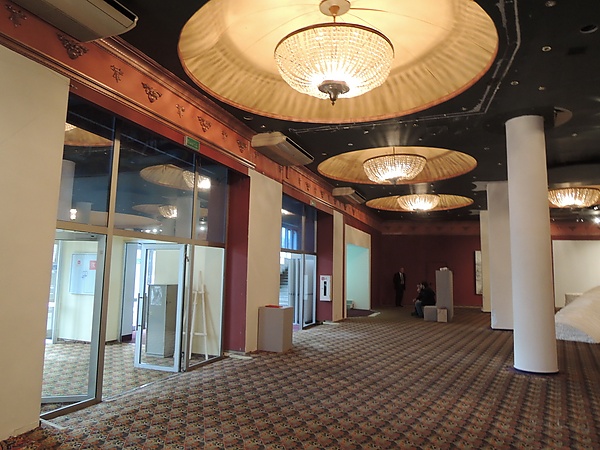 В фойе на первом этаже была устроена эстрада для выступления музыкальных групп и исполнителей перед показами. На другом конце фойе было организовано место для показа документальных и агитационных фильмов «на просвет» — с расположением кинопроектора сзади экрана[3]. Центральное фойе имеет оригинальный куполообразный потолок с декоративными углублениями — кессонами, благодаря чему создается уникальная акустика[9].