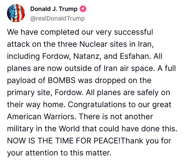 После атаки президент США Дональд Трамп написал в соцсети, что на подземный завод по обогащению урана в Фордо «был сброшен полный комплект бомб», и отметил, что Иран столкнётся с более разрушительными атаками, если не согласится на мир[5][6].
