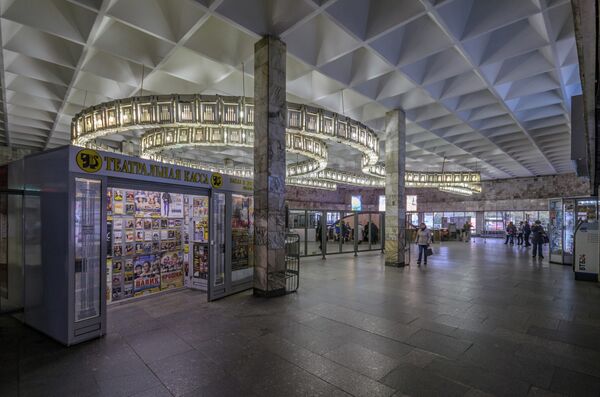 Лампы освещения, смонтированные в нишах свода перронного зала, закрыты декоративными решётками.