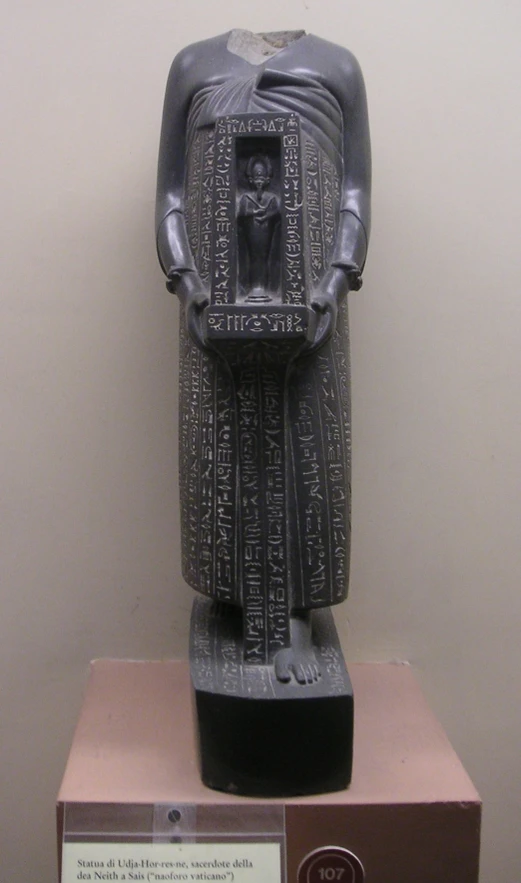 Уджагорреснет — влиятельный вельможа при дворе египетских фараонов и, как следует из его надписи[3], «начальник морских кораблей царя при царе Верхнего и Нижнего Египта Хнумибра (Амасисе II), начальник морских кораблей царя при царе Верхнего и Нижнего Египта Анхкара (Псамметихе III)…».