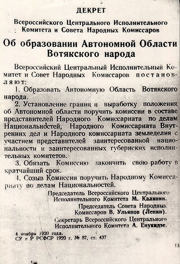 Декрет ВЦИК и СНК России «Об образовании Автономной Области Вотякского Народа», от 4 ноября 1920 года, дал начало образования Удмуртской автономной области[5] как автономное территориальное образование Автономная область Вотякского народа для компактного проживания коренного народа — вотяков (ныне — удмурты).