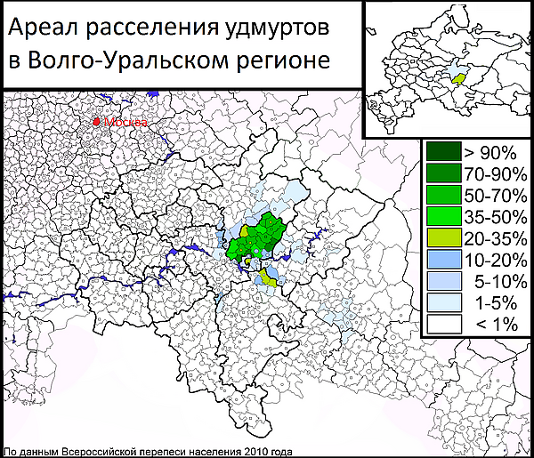 Удмурты проживают в европейской части России, преимущественно у подножия Урала, в междуречье Камы и низовья Вятки. Подавляющее большинство живёт в Удмуртской Республике и является коренным населением данного региона. Также удмуртская диаспора проживает в Башкирии, Татарстане, Кировской области, Пермском крае и в других регионах[16].