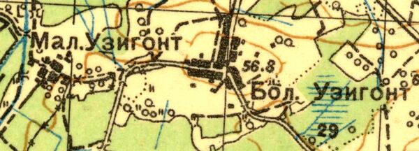 Согласно топографической карте 1931 года, деревня состояла из двух частей Малый Узигонт и Большой Узигонт, который насчитывал 29 дворов.