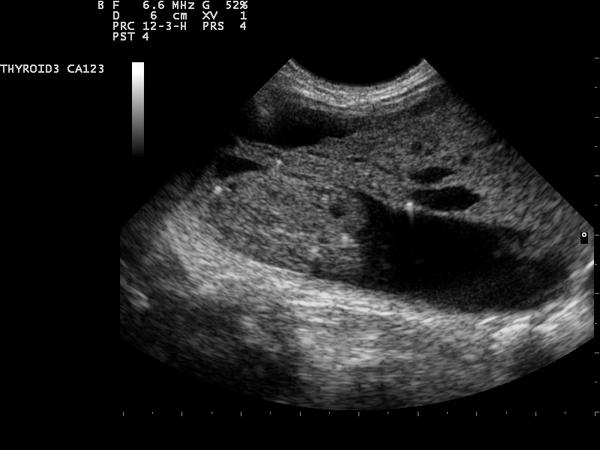 Обычно пальпаторно выявляются узлы, размеры которых превышают 1 см. С помощью датчика (частота 7,5 МГц) проводится эхоскопия (ультразвуковое исследование щитовидной железы). Метод существенно расширяет возможности практикующих врачей на этапе диагностического поиска — позволяет не только выявить дополнительное образование в щитовидной железе, но и установить основные признаки узла: характер роста, наличие капсулы, кальцинатов, фиброза, жидкости или коллоида внутри узла.