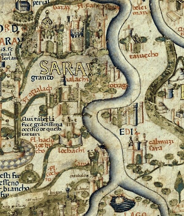 Считается, что впервые об этом городе пишет францисканский монах Гильом де Рубрук, не приводя его названия. Он писал о посещении в 1250-х годах некоего местечка с переправой через Волгу: новый посёлок «татары устроили вперемежку из русских и сарацин».[9]