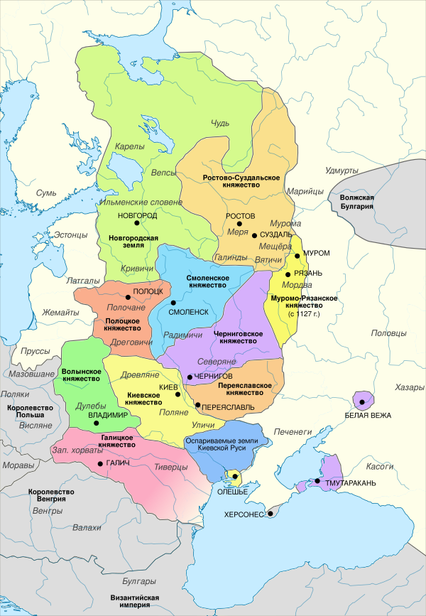 При Ярославе Мудром в Киеве возводились храмы, открылась библиотека, был издан свод законов — Русская Правда. Лишавшиеся наследных прав (см. лествичное право) представители разветвившейся династии Рюриковичей боролись за власть в определённых частях государства, часто вступая в союзы с половцами, заселившими южнорусские степи в XI веке. Права местных династий были признаны на Любечском съезде (1097), происходит постепенный распад Киевской Руси с образованием ряда княжеств, на территории современной Украины возникают Киевское, Волынское, Черниговское (юго-западные районы княжества), Переяславское, а также Галицкое (с 1140), объединённое в 1199 году с Волынским в единое Галицко-Волынское княжество, просуществовавшее до 1392 года, особое место заняло Киевское княжество, что было обусловлено положением Киева как «старейшего» княжения для всех русских земель и княжеств[24].