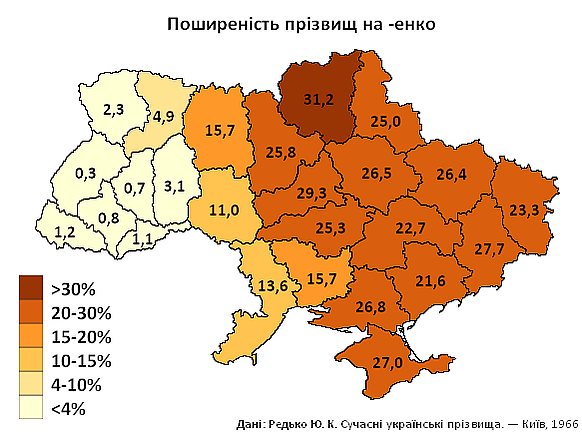 - -енко: патронимический суффикс, зафиксированный в звательном падеже. Типичен для казаков, горожан и крестьян Надднепрянской Украины. Примеры: Шевченко, Василенко, Овчаренко, Борисенко, Ткаченко, Федоренко, Терещенко, Яковенко, Тимошенко, Коваленко, Бондаренко, Проценко, Пархоменко, Ерёменко, Кириленко, Романченко, Симоненко, Савенко, Иваненко, Лукашенко, Петренко, Павленко, Иващенко, Скляренко, Кравченко, Кулишенко, Захарченко, Пономаренко, Кузьменко, Ноженко, Малюченко, Худенко, Ярошенко, Яценко, Солодченко, Сударенко, Стерненко, Сауленко, Сидоренко, Синенко, Кушнаренко, Петраченко, Порошенко, Прокопенко, Федорченко, Гейченко, Гузенко, Лубенко, Гуличенко, Марченко, Мартыненко.