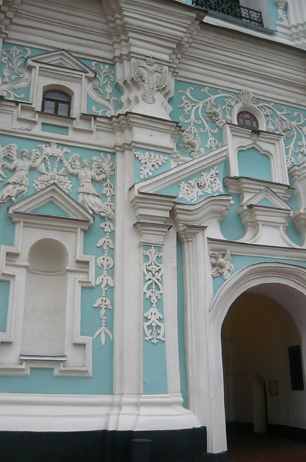 Характерная черта архитектуры украинского барокко: яркий цветной фон стен, чаще синий или голубой, и сплошной ковёр мелкого орнамента, состоящего из стилизованных завитков и натуралистически трактованных растений. Орнаментальный, поверхностно-маньеристичный принцип заметен и в использовании ордерных элементов: пилястры, колонки, фронтоны вместе с орнаментом вплетаются в общее кружево, как бы наложенное на плоскость стены. Несомненным является влияние украинского народного творчества, в частности, через орнаментацию печатных книг типографии Киево-Печерской лавры, основанной в 1616 году. Известно и критическое, даже слегка ироничное, отношение знатоков русской архитектуры к украинскому барокко. Так И. Э. Грабарь отмечал «кустарно-пряничный характер» украинской архитектуры[9]. Г. К. Лукомский именно в отношении украинского барокко сформулировал свой знаменитый афоризм, о том, что такое зодчество состоит «не в постройке украшения, а в украшении постройки», называя подобные здания «резными рамами» и «расписными пряниками»[10].