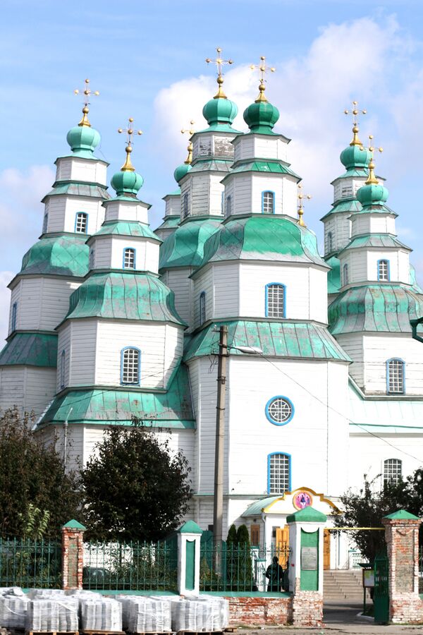 Каждый сруб венчает купол на гранёном барабане. Для храмов украинского барокко характерна особая грушевидная форма глав, завершённых маленькими главками. Излюбленный приём украинских зодчих — «заломы», то есть завершение храма в виде нескольких поставленных друг на друга ярусов, каждый из которых прорезает свод предыдущего. Переход от широкого восьмерика к меньшему решался с помощью оригинальной конструкции свода в виде срезанного пирамидального шатра с кровлей плавных очертаний.[12]