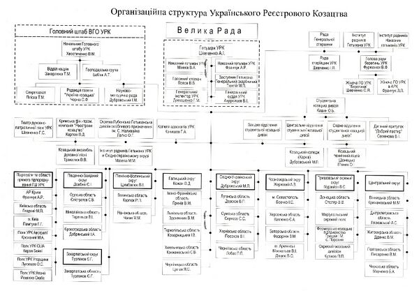 По данным сайта организации, в УРК зарегистрированы и действуют областные, городские, районные казачьи организации во всех областях Украины, в Автономной республике Крым, Киеве и Севастополе. Органы управления состоят из Генерального штаба УРК в Киеве, штабов УРК в областях, городах и районных центрах.