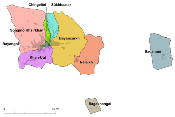 Улан-Батор с окрестностями образует самостоятельную административную единицу (официальное название: Улсын нийслэл — «Столица государства»), разделённую на 9 районов (монг. дүүрэг); районы разделены на кварталы-микрорайоны (монг. хороо). Территория, находящаяся под управлением мэрии Улан-Батора, включает в себя, помимо «костяка города», также возникшие после 1990 года новые кварталы застройки, складывающиеся из преимущественно одноэтажных жилых и хозяйственных построек, а также большого количества юрт. Новые районы соединены с центром автобусными линиями и маршрутного такси[81].