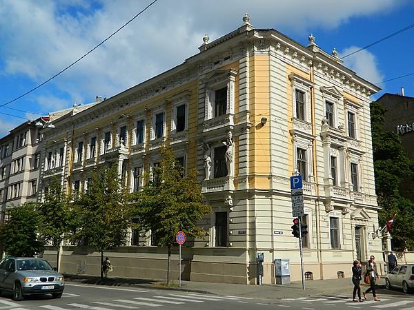 - Здание на улице Базницас, 35 в 1902 году построил архитектор Константин Пекшенс. В 1930-е годы здесь жили солистка Национальной оперы Милда Брехмане-Штенгеле, министр финансов Янис Aннус. Осенью 1989 года в подвале здания находился главный избирательный центр Народного фронта Латвии.