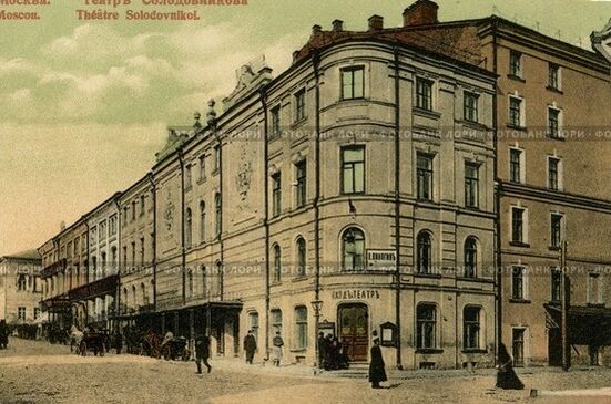В театре Солодовникова 6 мая 1896 года был проведён первый московский киносеанс: французский импресарио Рауль Гюнсбург представил картины братьев Люмьер, включая ставший позднее знаменитым фильм «Прибытие поезда на вокзал Ла-Сьота»[41]. В 1897—1898 годах здание театра было вновь перестроено архитектором И. Е. Бондаренко[42]. В 1907 года театр Солодовникова сгорел[43].