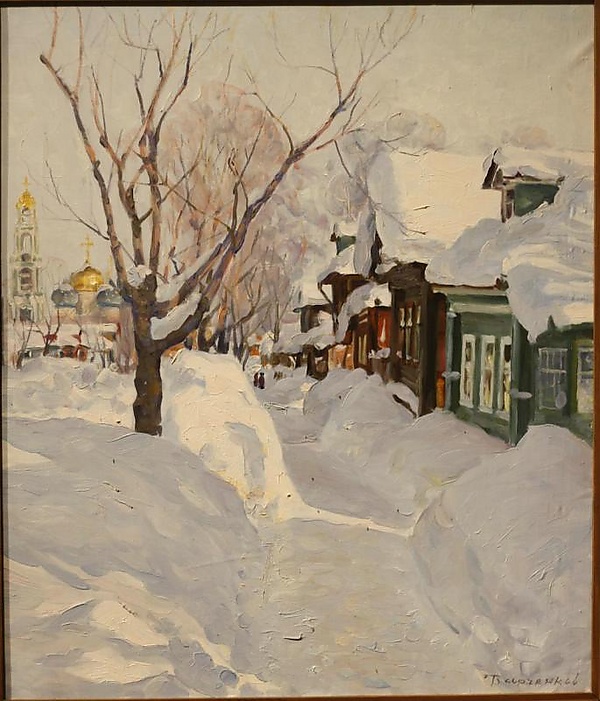 Полотно представляет собой городской пейзаж с расчищенной от снега улицей, уходящей вдаль. По обеим сторонам улицы лежат сугробы, выполненные в розовато-белых оттенках с крупными серо-голубыми тенями от зданий, что подчёркивает особенности цветовой гаммы. Справа вдоль улицы расположены деревянные одноэтажные дома под заснеженными крышами, слева — коричневые деревья. В глубине улицы видны фигуры людей. На дальнем плане слева выделяются колокольня и купола Успенского собора, завершая композицию в жанре ведута.