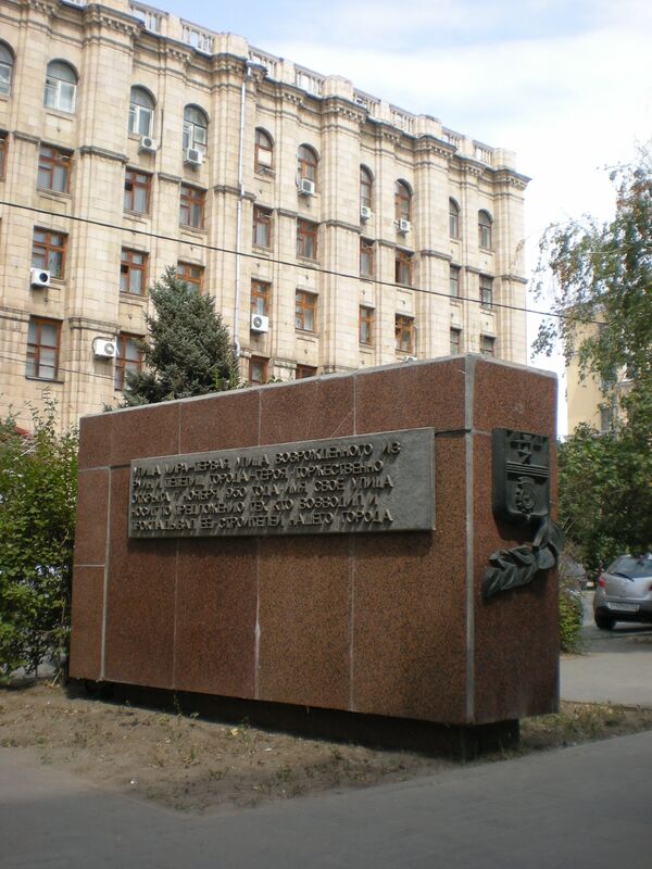 Памятный знак, посвящённый строителям улицы Мира открыт 30 апреля 1981 года напротив здания междугородней телефонной станции. Представляет собой гранитный параллелепипед, на гранях которого прикреплены две таблички с текстом и табличка с гербом Волгограда. Автор стихотворения на одной из табличек — Лев Кривошеенко.