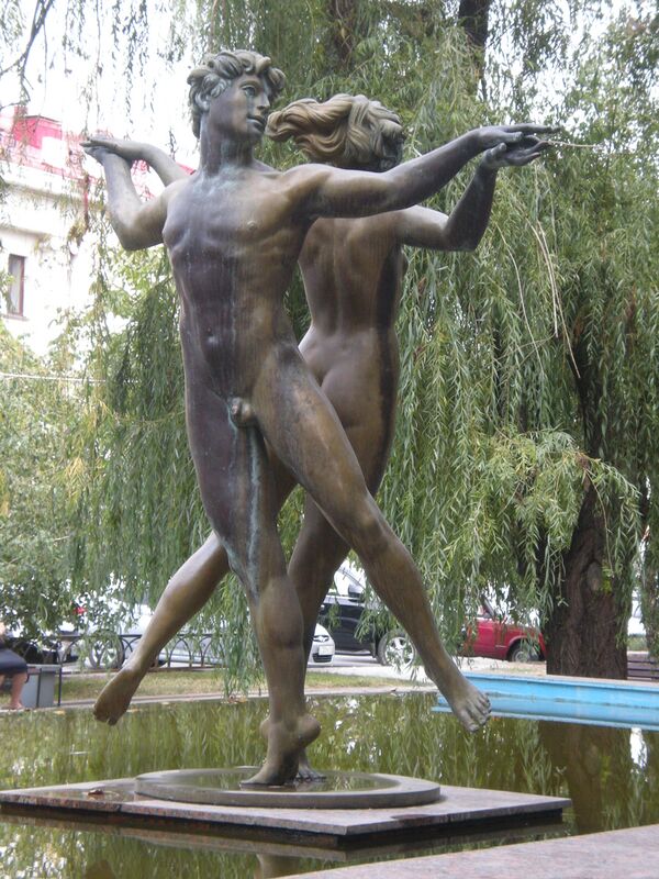 «Фонтан Любви» был открыт напротив здания Нового экспериментального театра 14 октября 2005 года на месте разрушенного в 1960-х годах фонтана «Каменный цветок». Скульптуру влюблённых выполнил из бронзы флорентийский скульптор Сильвио Белуччи. Инициатором же установки выступил глава Волгограда Евгений Ищенко, фонтан был своего рода подарком для невесты градоначальника[54]. Фонтан представляет собой скульптуры девушки и юноши, стоящих друг к другу спиной и держащихся за руки[55].