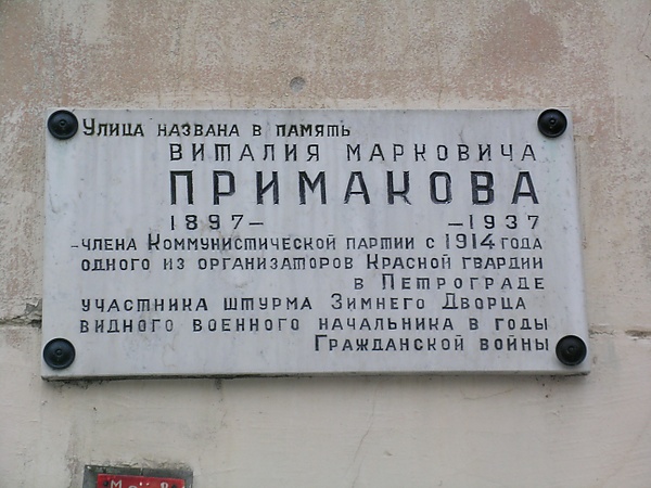 - На одном из домов установлена аннотационная доска с текстом: «Улица названа в память / Виталия Марковича / Примакова / 1897—1937 / — члена Коммунистической партии с 1914 года / одного из организаторов Красной гвардии / в Петрограде / участника штурма Зимнего Дворца / видного военного начальника в годы / Гражданской войны».