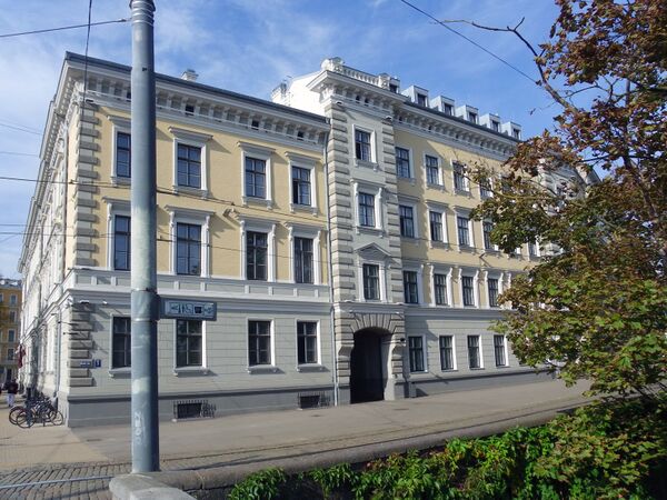 - Дом № 5, обращённый к улице Кришьяня Барона, построен в 1902—1904 годах как здание городской почты и телеграфа (архитектор Главного управления почт и телеграфов Л. И. Новиков, инженеры-строители Юлиус Пфайфер, В. И. Лунский); в последующем расширен пристройками (крыло вдоль улицы Радио построено около 1910 года), а в 1929—1932 годах надстроен двумя этажами, где разместился «Радиофон» и междугородная телефонная станция[2]. При отступлении немецких войск из Риги, 12 октября 1944 года, здание было сожжено[11]; в 1947—1950 восстановлено и приспособлено для учебных нужд (высшее военное училище, строительный техникум, в настоящее время — факультеты Латвийского университета; крыло по улице Радио занимает факультет истории и философии).
