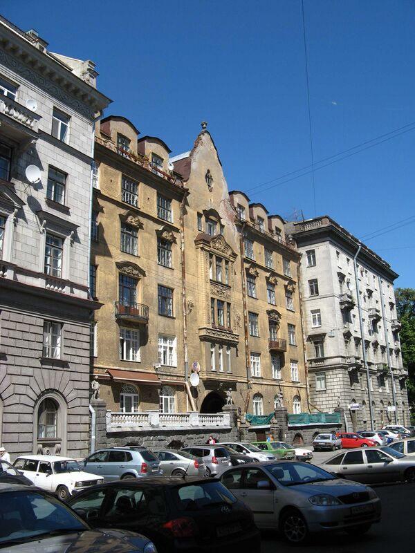 - Дом 7 — доходный дом М. Я. Стельп. Построен в 1910 по проекту Д. А. Крыжановского. [4] В квартире номер 12 этого дома, в квадратном окне, выходящем во двор, красовался витраж в виде паука с изогнутыми лапами, а паутина была собрана из прозрачных стёкол с полированным фацетом (утрачен при расселении коммунальной квартиры в 1990-е).[5]