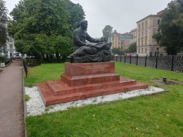 |Клиника нефрологии и урологии ПСПбГМУ им. И. П. Павлова]] (арх. Р. Г. Тетельбаум при участии Н. Вейсберна, проект 1970 года, реализован в 1977—1989 годах). Перед фасадом на углу улиц Рентгена и Льва Толстого расположен сквер Фёдора Углова[11]. В сквере расположена металлическая скульптура в виде чаши, обвитой змеёй, — символа медицины[12], а также памятник, представляющий собой собирательный образ медсотрудника, заботливо полусклонившегося над пациентом. На пьедестале начертаны слова Углова: «Труд врача — в высшей степени гуманен и благороден»[13].