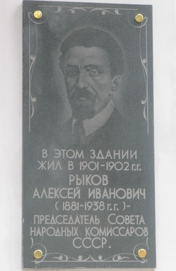 - Дом № 2 по ул. Шевченко: 2 этажа построены до 1900 года из красного кирпича, в 1950 году надстроены 3 и 4 этажи из белого кирпича (это видно на фото со двора). На доме установлена мемориальная доска: В этом здании в 1901—1902 гг. жил Рыков Алексей Иванович.