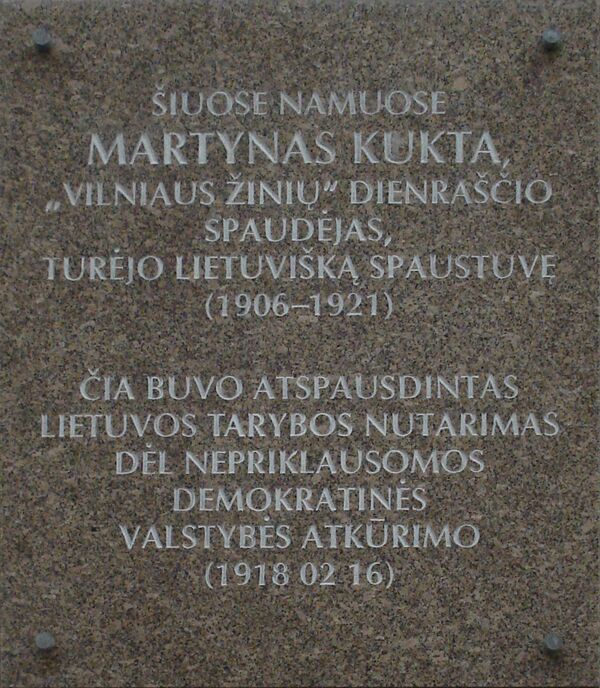 В доме под номером 20 с 1911 года действовала типография Мартина Кухты, в которой печатались различные издания на белорусском, литовском, польском языках, в том числе периодические издания „Viltis“ (1907—1915), „Litwa“ (1908—1914), „Sveikata“ (1909—1915), „Žemdirbys“ (1909—1913), „Garsas“ (1909—1914), „Aušra“ (1911—1915), „Lietuvių tauta“ (1911—1914), „Lud“ (1912—1913). 19 февраля 1918 года Кухта первый отпечатал текст подписанного накануне Акта независимости Литвы. 16 февраля 2005 года на этом доме при участии Чесловаса Юршенаса и поэта Юстинаса Марцинкявичюса была торжественно открыта мемориальная доска с надписью на литовском языке[3] [4] [5]: