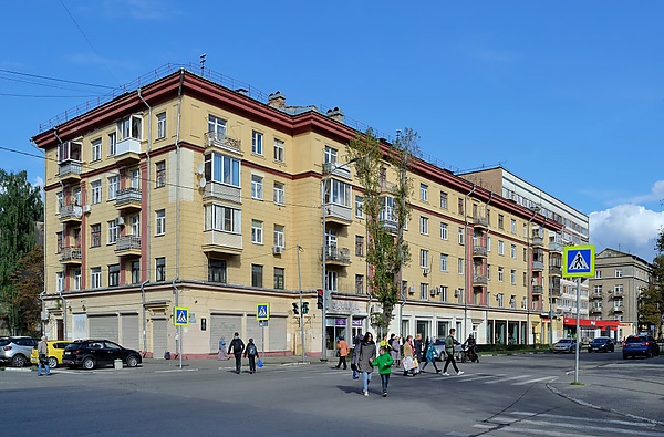 На месте многоэтажного жилого комплекса в начале улицы находилось двуххэтажное здание с магазином «Вина», который прозвали «Аптека», и нотариусом на втором этаже. Новое здание в постмодернистском стиле построено в конце XX — начале XXI века по проекту архитектора А. Н. Панина. Через дорогу от него находится здание лицея, построенное в 1930-е годы по проекту архитектора П. И. Клишева[3].