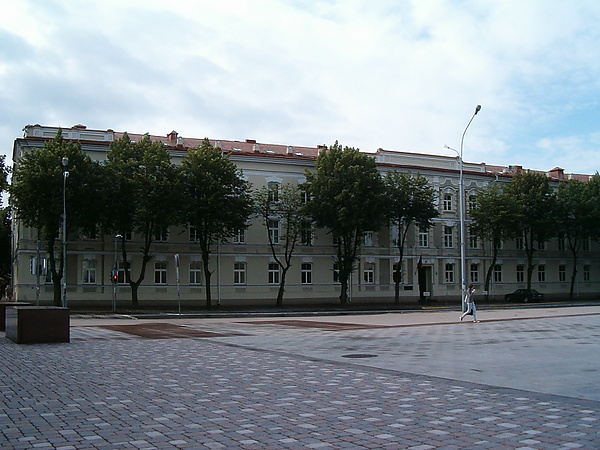 Нумерация домов начинается от улицы Пилес. В большом угловом здании размещается Министерство внутренних дел Литвы (Šventaragio g. 2). Около 1870 года была произведена капитальная реконструкция здания по проекту и под руководством виленского архитектора Ивана Левицкого, после чего оно приобрело свой вид, в целом сохранившийся до наших дней. До 1915 года это длинное здание занимало Губернское правление и другие российские правительственные учреждения. В период между двумя мировыми войнами в этом здании размещалась управа Виленского воеводства (Urząd Wojewódzki Wileński).