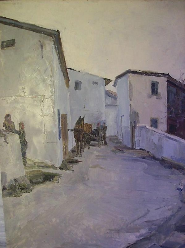На полотне представлен пейзаж, изображающий часть улицы с каменными домами по сторонам. Между зданиями стоит лошадь в упряжке. Около дома слева расположены две женские фигуры, что подчёркивает характер сцены в традициях бытового жанра.