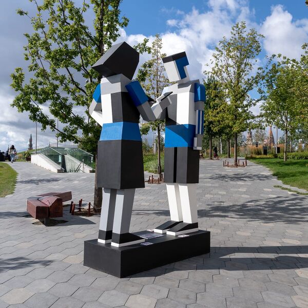 Широко известна документация уличной акции Славы Ptrk «П@#уй пляшем» (2018)[99] — пятьдесят пар танцуют вальс на льду замерзшего пруда в Екатеринбурге, в какой-то момент они останавливаются и с высоты птичьего полета становится видна та самая надпись, саркастически призывающая не прекращать веселиться даже в самой безнадежной ситуации. Акция получила широкий резонанс в СМИ, как и работа «Совсем рядом» (2018)[100], созданная в соавторстве со скульптором Сергеем Каревым: на набережной напротив Кремля в Москве художники установили канализационную решетку с приваренными к ней с обратной стороны руками: как будто человек держится за прутья тюремной камеры. «Дню милиции посвящается», — сказал об этой работе один из авторов, имея в виду громкие судебные процессы последних лет, уголовное преследование за репосты в социальных сетях и превращение страны в «одну большую зону». Несмотря на то что Слава Ptrk обращается к постиронии, намеренно размывая границы серьёзности, часто он осознанно создает смелые и вовсе не иронические политические высказывания.