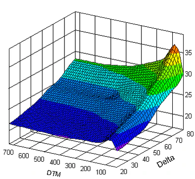Полезно визуализировать подразумеваемую волатильность как функцию от цены исполнения (страйка) и времени до экспирации[11]. Результатом становится двумерная изогнутая поверхность, построенная в трёхмерном пространстве, где текущая рыночная подразумеваемая волатильность (ось ) представлена в зависимости от цены исполнения (ось ) и времени до истечения (ось , обозначаемая как срок до погашения [англ. Days-to-Maturity, DTM]). Это называется абсолютной поверхностью подразумеваемой волатильности. Замена координаты цены исполнения на дельту опциона даёт нам относительную поверхность подразумеваемой волатильности.