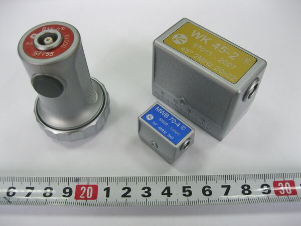 Для контроля изделий с внешним диаметром менее 200 мм, необходимо использовать преобразователи, с радиусом кривизны подошвы R, равным 0,9-1,1R радиуса контролируемого объекта, так называемые притёртые преобразователи, которые в таком виде непригодны для контроля изделий с плоскими поверхностями. Например для контроля цилиндрической поковки, необходимо производить перемещение преобразователя в двух взаимно перпендикулярных направлениях, что подразумевает под собой использование двух притёртых преобразователей — по одному для каждого из направлений.