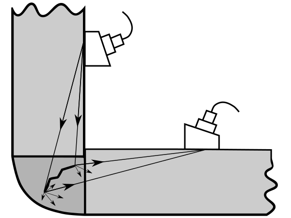 - Зеркальный или Эхо-зеркальный метод — используются два преобразователя с одной стороны детали: сгенерированные колебания отражаются от дефекта в сторону приёмника. На практике используется для поиска дефектов расположенных перпендикулярно поверхности контроля, например трещин.