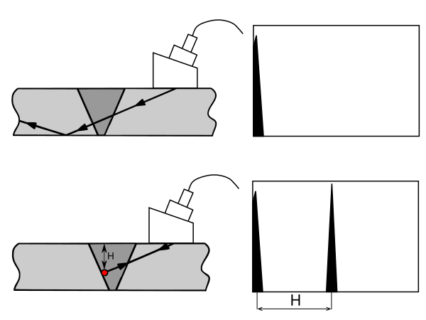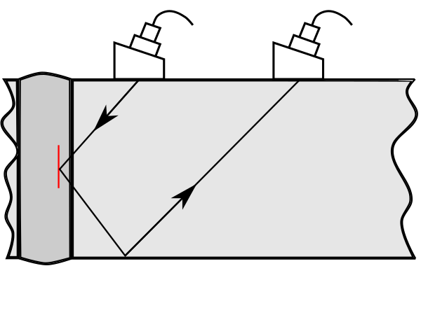 - Дифракционно-временной метод — используется два преобразователя с одной стороны детали, расположенные друг напротив друга. Если дефект имеет острые кромки (как, например, трещины) то колебания дифрагируют на концах дефекта и отражаются во все стороны, в том числе и в сторону приёмника. Дефектоскоп регистрирует время прихода обоих импульсов при их достаточной амплитуде. На экране дефектоскопа одновременно отображаются оба сигнала от верхней и от нижней границ дефекта, тем самым можно достаточно точно определить условную высоту дефекта. Способ достаточно универсален, позволяет производить ультразвуковой контроль на швах любой сложности, но требует специального оборудования для фиксации преобразователей, а также дефектоскоп, способный работать в таком режиме. Кроме того, дифрагированные сигналы достаточно слабые.