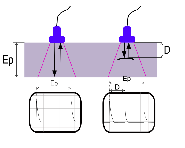 - Эхо-метод или эхо-импульсный метод — наиболее распространённый: преобразователь генерирует колебания (то есть выступает в роли генератора) и он же принимает отражённые от дефектов эхо-сигналы (приёмник). Данный способ получил широкое распространение за счёт своей простоты, так как для проведения контроля требуется только один преобразователь, следовательно при ручном контроле отсутствует необходимость в специальных приспособлениях для его фиксации (как, например, в дифракционно-временном методе) и совмещении акустических осей при использовании двух преобразователей. Кроме того, это один из немногих методов ультразвуковой дефектоскопии, позволяющий достаточно точно определить координаты дефекта, такие как глубину залегания и положение в исследуемом объекте (относительно преобразователя).